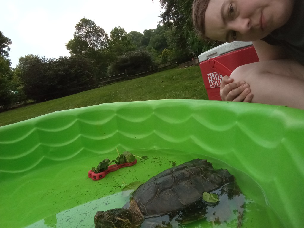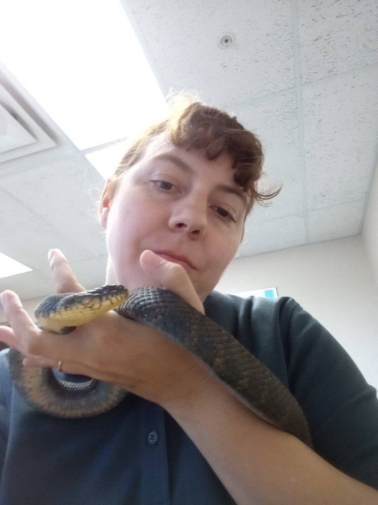 My philosophy when it comes to working with ambassador animals is a balance between respect for the animals’ autonomy and the educational values the add by being on program. Whenever possible I want to give the animal the option to not participate in a program. Ideally this is done through training so that they know how to communicate their disinterest to me but also through keen observation of their behaviors. There are times when an animal shows disinterest but the needs of the program override their objections. In these instances I pay additional attention to the animal’s behavior on program watching for signs of stress that tell me the animal has done enough work and is ready to return to their enclosure.